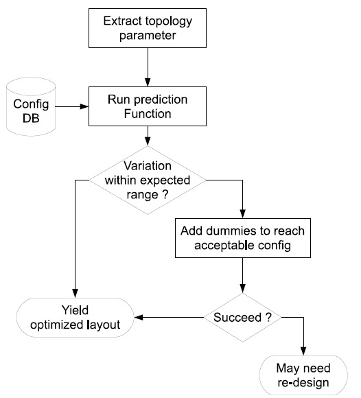 Most of the CMP models use process parameters[8]. They help to adjust equipments characteristics during wafer processing. But can’t be used by the designer in order to optimize final layout to improve yield. So, most of the time, a simple rule, based on metal density in each window, is applied. Metal fills are added in order to reach an average density value within these windows[11]. Unfortunately, CMP process is a little bit more complex, and we propose to define a prediction function, less accurate than a real model, but accurate enough at design stage and capable of influencing more precisely metal filling. The idea is to study various layout configurations, to measure the physical variations related to CMP process on these different configurations, then to compare the chip layout to the known standard configuration and predict the expected variations. If needed, a dedicated metal filling engine will then be able to insert the expected dummy geometries in order to modify the layout configuration to be as close as possible to a “good” topology, i.e. a configuration that creates variations within allowed range.