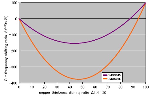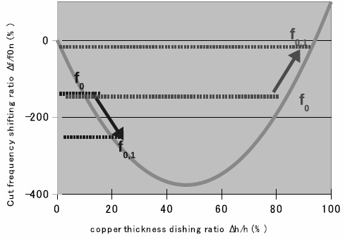 Figure 3. Dependence between copper thickness and cutoff frequency Cut frequency function is not a linear function and 2 different values of thickness variation may be deduced from frequency measure. But we can easily compute capacitor from cut frequency f0. We then compare with cut frequency f0,1 of a higher density test structure where we expect to have a greater dishing ratio. We will then be able to deduce the exact thickness variation ?h: • if f0,1 is lower, ?h being higher, then slope is negative. • if f0,1 is higher, ?h being higher, then slope is positive. See figure 4.