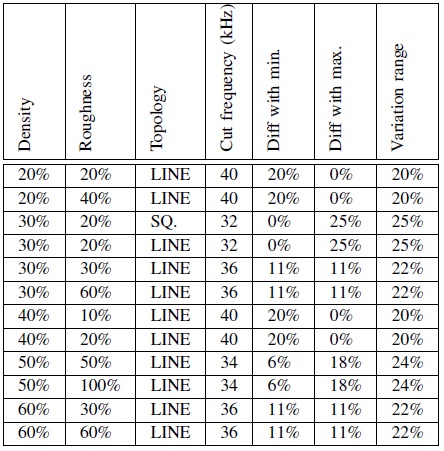 Table I RESISTOR MEASUREMENT ACCORDING TO TOPOLOGY We can see that we have a variation range of about 23% on the metal wire resistance depending on the topology of the surrounding area. All available sites on the wafer have been measured with a variation of less than 5% across the wafer for a given test structure. We can then confirm that this variation is only due to the topology configuration surrounding each test structure. Additional measures made on the cut frequency of the low pass filter made of the copper line resistor and the coupling capacitor between the 2 overlapping metal wires leads to the same results. Partial results are presented in table II. 2) Thickness measures: Thanks to Scanning Electron Microscopy (SEM), measurement of copper lines thickness have been performed on silicon. Partial results are presented in table III We can also verify that the variation range is also within 20%. We also have made a correlation between the results