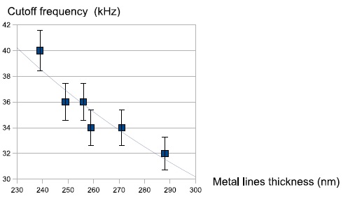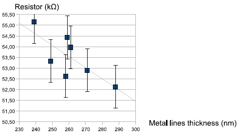 Figure 8. Line resistor vs. metal thickness The results obtained clearly show the relation between thickness and electrical measurements. The cut-of frequency lets appear less dispersion. It confirms that dual measures by different methods are mandatory to get an accurate estimation of the thickness. Additional measures will be performed to validate the correlation function through a statistical approach.