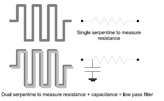 Figure 1. Copper dishing impact on electrical parameters As the measure structure must be as small as possible, the capacitor made from the two overlapping serpentines will remain very low and very difficult to measure accurately. So, we will not directly measure this capacitor but the cut-off frequency of a low pass filter made of the resistance and capacitance of the metal wire (Fig 2).