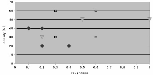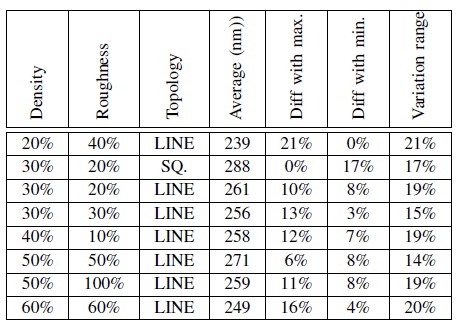 We can roughly differentiate regular stripes from random polygons. We will focus on these 3 parameters, with a priority on density and roughness as these are the factors that can be more easily adjusted during layout or place and route phase of the design. The measure of the density is a simple value between 0 and 1, but the roughness is more complex as it is related to the sum of the perimeters of the polygons in a given area. This value is directly related to process node and has no default maximum value. In order to normalize this value, we will take into account the minimum pitch of copper and consider that the maximum roughness is obtained with the smallest possible squares of metal placed with the minimum spacing. We will then be able to define the roughness also as a value between 0 and 1. A value of “1” corresponds to the highest possible roughness for the current process and layer. Other parameters like gradient [3]may also be used during metal filling step but are not relevant during initial analysis.