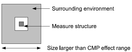 1) Constraints: The CMP monitoring structures should be large enough to measure CMP impact within a wide area (up to a few hundreds of microns). The goal is to provide test structures that can be adjusted to fit in any available area on silicon. We need to develop CMP monitoring structure: • flexible to fit in any empty areas of a Multi Project Wafer (MPW), i.e. an assembly of heterogeneous dies usually used for prototypes or test purposes. • offering an access to the multiple available parameters • easily measurable (electrically) Each test structure will be made of two different parts (fig 5): • the environment that should offer the expected characteristics of the multiple criteria: density, roughness and topology • the measured structure that will be surrounded by the “environment” and that should allow to accurately measure the metal thickness variation (copper dishing ratio).
