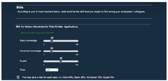 6) According to your 6 most important topics, what would be the skill level you expect to find among your employees / colleagues. The goal of this additional question is to correlate the different answers and confirm the results based on the first answers. To answer this question, the user select the repartition of his subordinates with the different knowledge levels (Expert, Advanced, Basic). For example, 10% of the employees should be experts of the domain and 50% should have an advanced knowledge. If the total is less than 100%, remaining employees may not have any particular skill in the domain. See figure 2.
