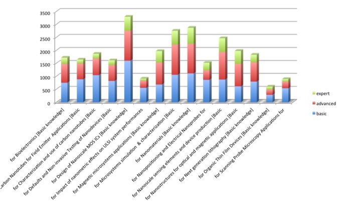 The results of the survey are presented on NanoSkills WEB site [Sur, 2011]. The results are consistent and many interesting conclusions have been made. Regarding the level of interest, the score for each course goes from 0 (no interest) to 3 (high), so the average value is 1.5. All the proposed courses are considered to fulfill a more than average interest. We can first conclude that the university world is close to the industry needs. If we cross check the results from question 3 and 4 on one hand (expected skill level) with answers of question 5 and 6 on the other hand (interest and needs), globally the skills expected among employees are in close agreement with the individual objectives or interests. See figure 5.